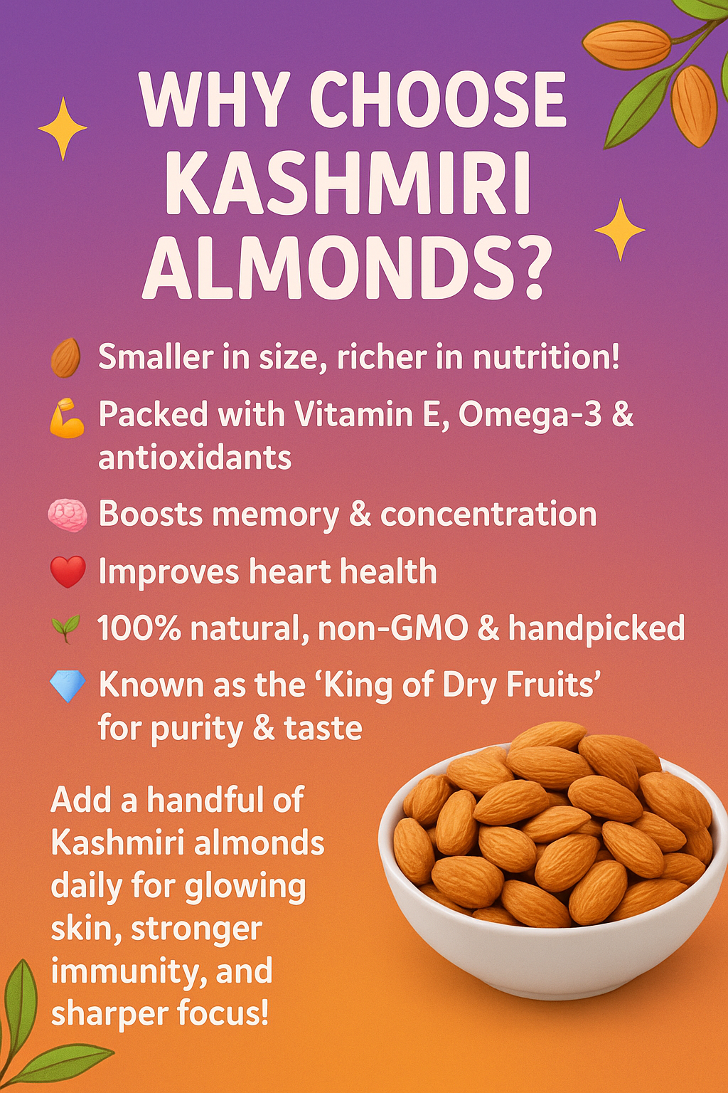 Almonds are a versatile and nutritious nut that can elevate any diet. Packed with vitamins and minerals, they offer numerous health benefits, including improved heart health and enhanced brain function. These small, crunchy delights are rich in healthy fats, protein, and fiber, making them an excellent snack option for those seeking a healthy lifestyle. Almonds can be enjoyed raw, roasted, or even incorporated into various dishes, from salads to desserts. They also serve as a fantastic base for almond milk and nut butter, providing a dairy-free alternative for many. With their delightful flavor and myriad of uses, almonds are a staple in kitchens around the world, cherished not only for their taste but also for their contribution to overall well-being. Enjoy snacking on these nutrient-dense gems or use them creatively in your cooking!